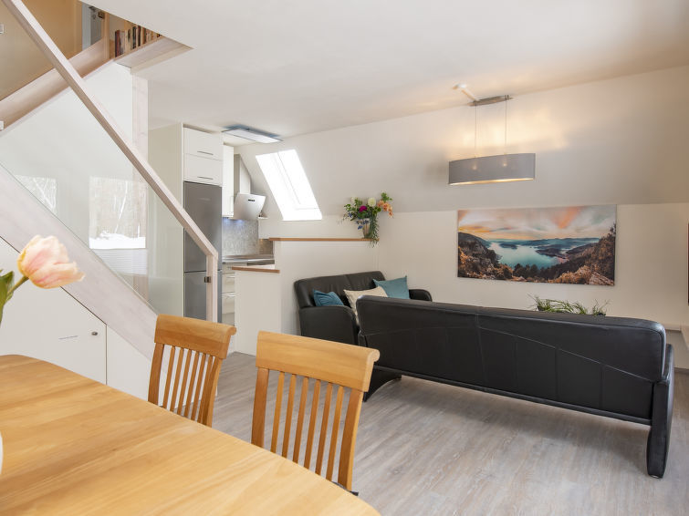 4-Zimmer-Haus 75 m2 auf 2 Stockwerken. Sehr geschmackvoll und gemütlich eingerichtet: Wohn-/Esszimmer mit Kabel-TV und Flachbildschirm. Ausgang zur Terrasse. 1 Zimmer mit 1 Doppelbett (180 cm, Länge 200 cm), Sat-TV. Offene Küche (Backofen, Geschirrspüler, 4 Glaskeramikplatten, Toaster, Wasserkocher, Mikrowelle, Tiefkühler, elektrische Kaffeemaschine). Dusche/WC. Dachgeschoss: abgeschrägt 1 Zimmer mit 2 Betten und Sat-TV. 1 Zimmer mit 2 Betten und Sat-TV. Fussbodenheizung. Grosse Terrasse 33 m2. Terrassenmöbel, Elektrogrill, Liegestühle (2), Abstellkammer. Zur Verfügung: Waschmaschine, Safe, Fliegengitter, Kinderhochstuhl, Babybett, Haartrockner. Internet (WLAN, gratis). Bitte beachten: Nichtraucher-Haus. Rauchmelder, Feuerlöscher. Im Wohnzimmer Smart-TV. Fahrradständer am Haus vorhanden. Barrierefreier Zugang zum Haus. Buchungen sind nur zu touristischen Zwecken erlaubt.