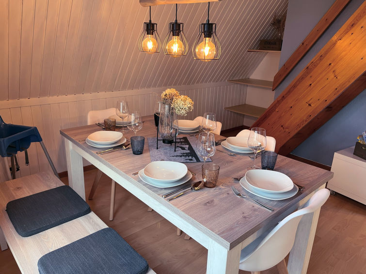 4-Zimmer-Haus 70 m2 auf 2 Stockwerken. Einfach und gemütlich eingerichtet: Wohn-/Esszimmer mit Kabel-TV und Flachbildschirm. Ausgang zur Terrasse. 1 Zimmer mit 1 Doppelbett (180 cm, Länge 200 cm), Kabel-TV (Flachbildschirm). Offene Küche (4 Kochplatten, Backofen, Geschirrspüler, Toaster, Wasserkocher, Mikrowelle, Tiefkühler, elektrische Kaffeemaschine). Bad/WC. Obergeschoss: (steile Treppe) 1 abgeschrägtes Zimmer mit 2 Betten (90 cm, Länge 200 cm). 1 abgeschrägtes Zimmer mit 2 Betten (90 cm, Länge 200 cm). G-Heizung. Holzdielenboden. Terrasse 30 m2. Terrassenmöbel, Elektrogrill (mobil), Liegestühle (2). Sicht auf den Wald. Zur Verfügung: Kinderhochstuhl, Babybett. Internet (WLAN, gratis). Bitte beachten: Nichtraucher-Haus. Maximal 2 Haustiere/Hunde erlaubt. Rauchmelder. Minigolfschläger und Bälle vorhanden. Buchungen sind nur zu touristischen Zwecken erlaubt.