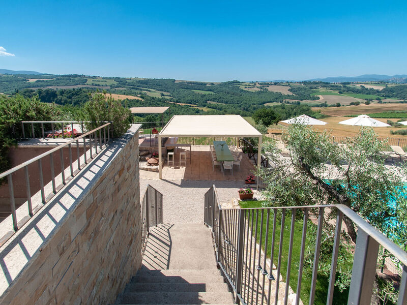 Diese moderne, helle und komfortable Villa ist perfekt in die Landschaft integriert und für diejenigen ideal, die einen Urlaub inmitten der Natur verbringen möchten, ohne auf Komfort verzichten zu müssen. Moderne, freistehende, komfortable Villa "Futura", 350 m.ü.M., Baujahr 2015, umgeben von Feldern. 9 km vom Zentrum von Todi, sonnige Lage auf einem Hügel. Zur Alleinbenutzung: Garten 1'000 m2, Schwimmbad (6 x 12 m, 145 cm tief, saisonale Verfügbarkeit: 07.Apr. - 30.Sep.) mit Innentreppe. Aussendusche, Sitzplatz, Gartenmöbel, Grill, Kinderspielplatz. Im Hause: Fahrräder vorhanden (extra). Zur Verfügung: Fahrräder (5). Wohnungsreinigung täglich möglich (extra). Haushaltshilfe täglich möglich (extra). Zufahrt (100 m Naturweg). Parkplatz (für 4 Autos, überdacht) beim Haus. Lebensmittelgeschäft 3 km, Supermarkt 6 km, Restaurant 3 km, Bar 3 km, Bahnstation "Todi (Ponte Rio)" 8 km, Badesee "Trasimeno" 53 km. Nahe gelegene Sehenswürdigkeiten: Bevagna 26 km, Spoleto 37 km, Foligno 30 km, Orvieto 41 km, Perugia 45 km. Bitte beachten: Fahrzeug empfohlen. Babyausstattung. Jugendgruppen nur auf Anfrage. Geeignet für Events.