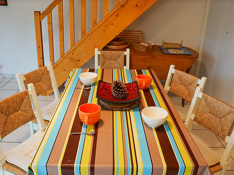 Huis in een rij 4-kamers 70 m2 op 2 verdiepingen. Comfortabel ingericht: woon-/eetkamer met open haard en Flatscreen TV. 1 kamer met 1 2-pers bed. Groot kookhoek (4-pits kookplaat, oven, afwasmachine, 4 keramische glas kookplaten, elektrische koffiemachine). Douche/WC. Bovenverdieping: 1 kamer met 1 uitschuifbaar bed (2 pers.). 1 kamer met 1 2-pers bed. Bad/WC. Elektrische verwarming, air-conditioning. Terras, op het westen gelegen, zithoek in de tuin. Terrasmeubelen, ligstoelen. Ter beschikking: wasmachine, strijkijzer. Internet (WiFi, gratis). Parkeerplaats nr. 18 (2 Auto's). Niet rokers woning. Maximaal 1 huisdier/hond toegestaan. Rookmelders.