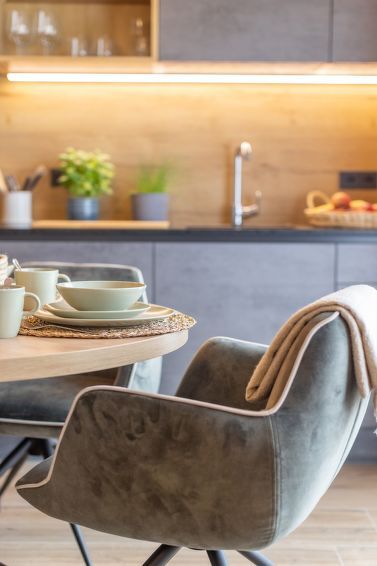"Top 6", appartement 2-kamers 65 m2 op de 2e verdieping. Licht, zeer modern en smaakvol ingericht: hal. 1 2-pers. kamer met Kabel-TV (Flatscreen TV). Woonkeuken (oven, afwasmachine, broodrooster, waterkoker, elektrische koffiemachine) met 1 2-pers divanbed, eettafel en Kabel-TV (Flatscreen TV). Uitgang naar het balkon. Douche/WC. Vloerverwarming. Natuurstenen vloeren. Groot balkon 15 m2. Balkonmeubilair. Zeer mooi uitzicht op de bergen en het landschap. Ter beschikking: Internet (WiFi, gratis). Rookvrij huis. 1 huisdier/hond toegestaan. Rookmelders. 50602-000351-2022