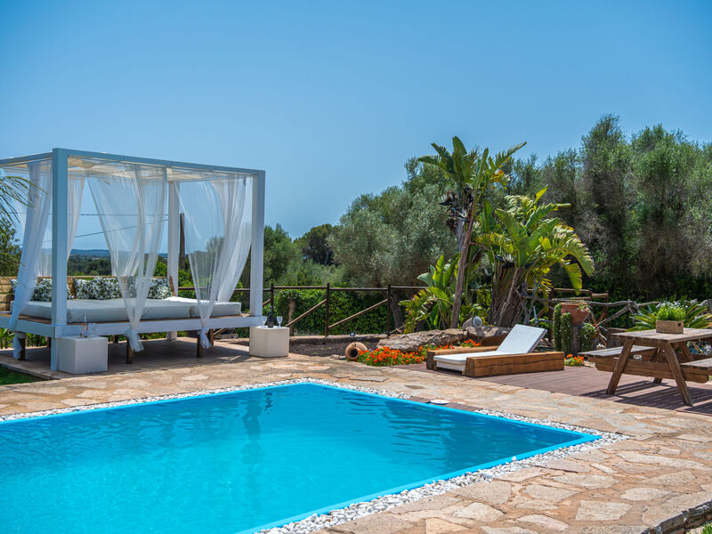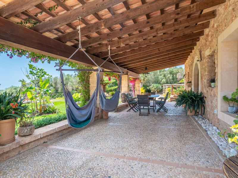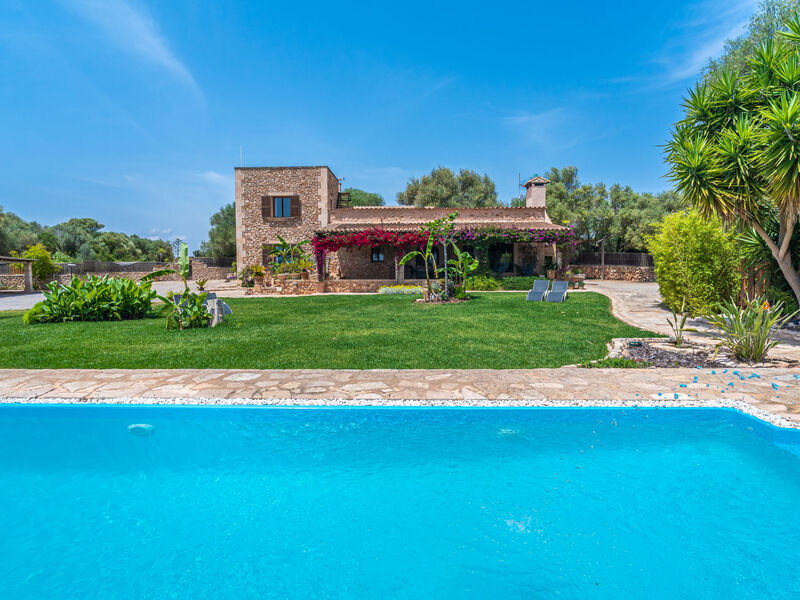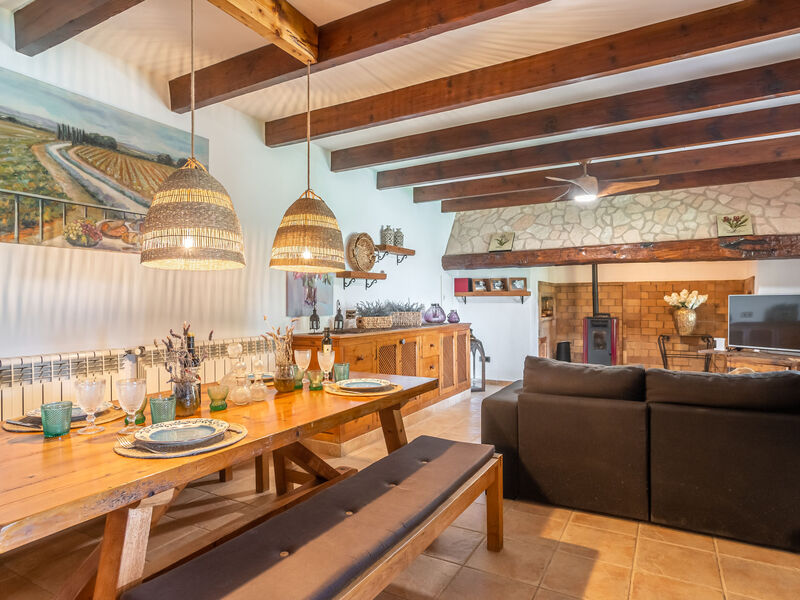 Zeer mooi, comfortabele villa "Sa Caseta", van 2 verdiepingen, gerenoveerd. Huurobject bestaande uit hoofd-/ bijgebouw, buiten de plaats, 6 km van het centrum van Ses Salines, rustige, zonnige ligging, 12 km van zee, te midden van groen. Voor alleengebruik: mooie, verzorgde tuin met gazon en planten, openluchtzwembad hoekig (10 x 4 m, 90 - 210 cm diepte, seizoensgebonden beschikbaarheid: 01.Jan. - 31.Dec.) met zout-elektrolyse. Buitendouche, patio, prieel, prieel, tuinmeubelen, barbecue, kinderspeelplaats, onderhoud zwembad door de eigenaar/tuinman. In het huis: bergruimte voor fietsen, centrale verwarming. Toegangsweg (500 m onverharde weg). Parkeerplaats bij het huis op het terrein. Winkel 6 km, supermarkt 6.2 km, restaurant 6.3 km, bar 6 km, bakkerij 6.2 km, bushalte "Ses Salines" 6 km, treinstation "Manacor" 37 km, zandstrand "Es Trenc" 12 km, rotsstrand "Es Caló des Moro" 6 km. Jachthaven 11.5 km, golfterrein (18 holes) 20 km, fietspad 200 m. Attracties in de buurt: Santanyí 7 km, Cala Santanyí 8 km, Colonia Sant Jordi 11.4 km, Palma City 52 km, Felanitx 19 km. Wandelgebied Serra de Tramuntana, Cap Ses Salines - Cala Llombards 12KMS. Auto noodzakelijk. Het objekt is geschikt voor 6 volwassenen. De eigenaar accepteert geen jeugdgroepen. Dieren in de buurt. Vliegveld 48 km van het huis.
