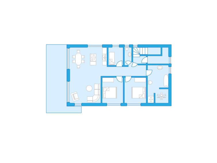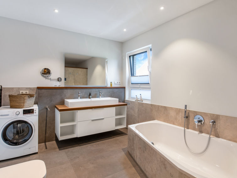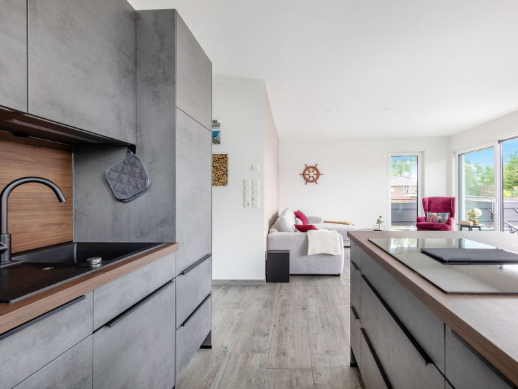 Apt 4 pièces 96 m2. Spacieux et clair, aménagement confortable et moderne: à l'étage supérieur: grand séjour/salle à manger avec TV (satellite) (écran plat). Sortie sur le balcon. 2 chambres, chaque chambre avec: 1 lit double (180 cm, longueur 200 cm), TV (satellite) (écran plat). 1 chambre avec 1 lit (90 cm, longueur 200 cm). Cuisine ouverte (four, lave-vaisselle, 4 plaques vitrocéramiques, grille-pain, bouilloire électrique, micro-ondes, cafetière électrique, ilot de cuisine). WC séparé, bain/douche/WC, double vasque, Sauna. Chauffage au gaz. Grand balcon 30 m2. Mobilier de balcon. A disposition: lave-linge, chaise haute pour enfant, lit bébé. Internet (Connexion WIFI, gratuit). Veuillez noter: logement non-fumeur. Les réservations ne sont autorisées que pour des vacances.