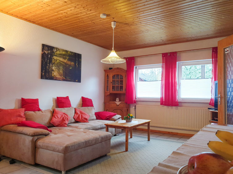"Haus Tausendschön", maison 3 pièces 70 m2, au rez-de-chaussée. Aménagement confortable et plaisant: séjour/salle à manger 25 m2 avec TV (satellite) (écran plat), lecteur CD et DVD. 2 chambres 9 m2, chaque chambre avec: 2 lits (90 cm, longueur 200 cm). Cuisine ouverte 6 m2 (4 plaques de cuisson, four, lave-vaisselle, four micro-ondes, congélateur, cafetière électrique). Douche/WC. Chauffage au gaz. Petite terrasse 6 m2 partiellement couverte, jardin 300 m2, pelouse 250 m2. Meubles de terrasse, barbecue, réduit. A disposition: chaise haute pour enfant, sèche-cheveux. Internet (Connexion WIFI, gratuit). Place de parking. Veuillez noter: maison non-fumeur. Maximum 1 animal/ chien autorisé. Détecteur de fumée.