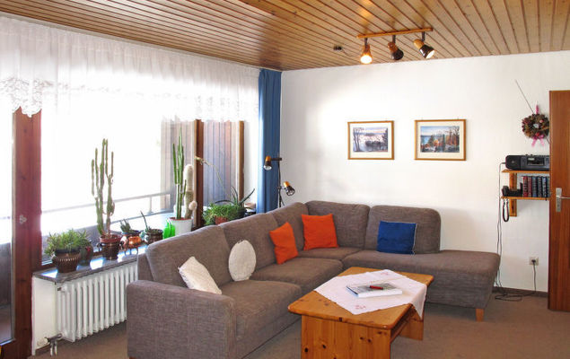 Apt 2 pièces 58 m2 au 1er étage. Séjour/salle à manger avec table pour les repas et TV (satellite). Sortie sur le balcon. 1 chambre avec 1 lit double. Petite cuisine (four, 4 plaques vitrocéramiques, grille-pain, four micro-ondes, cafetière électrique). Bain/WC. Chauffage. Moquette. 2 balcons. Mobilier de balcon. A disposition: Internet (Connexion WIFI, gratuit). Veuillez noter: logement non-fumeur. 1 animal/ chien autorisé. Détecteur de fumée.