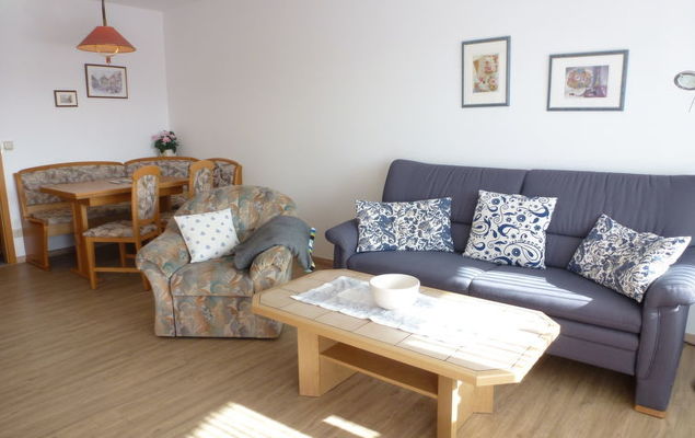 Apt 2 pièces 46 m2, en sous-sol. Séjour/salle à manger avec TV (satellite) (écran plat). Sortie sur le balcon. 1 petite chambre double. Petite cuisine (four, cafetière électrique). Douche/WC. Mobilier de balcon. Place de parking No 86. Veuillez noter: logement non-fumeur.