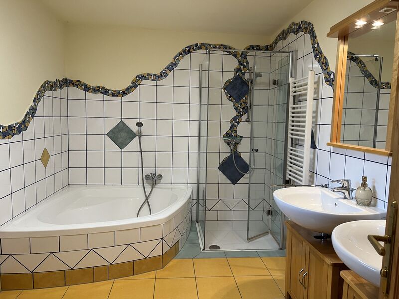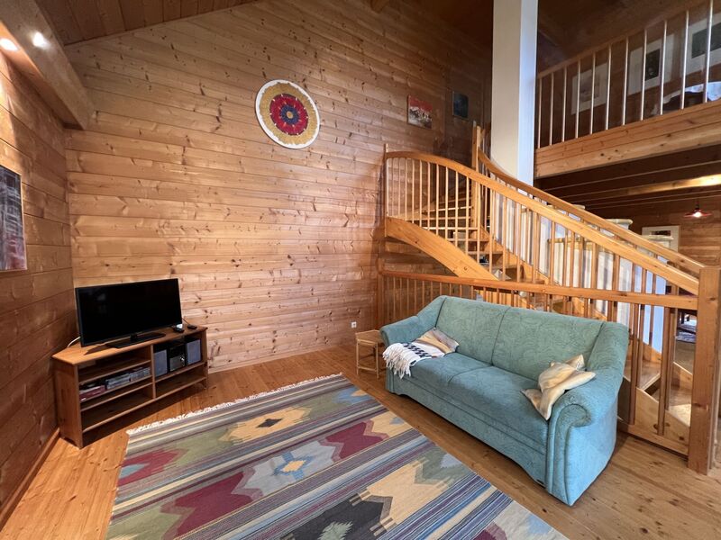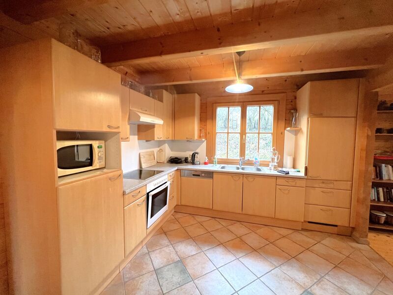 4 pièces cottage 130 m2 sur 3 niveaux. Clair, aménagement confortable et avec beaucoup de bois: grande entrée. Salle à manger ouverte. Sortie sur la terrasse. Séjour ouvert avec 1 divan-lit double, TV (satellite), écran plat et poele de faience. Sortie sur le jardin. 1 chambre double. Galerie ouverte. Sortie sur le balcon. Cuisine ouverte (four, lave-vaisselle, 4 plaques vitrocéramiques, micro-ondes, cafetière électrique). Bain/douche, WC séparé, double vasque avec baignoire d'angle. Chauffage par le sol. À l'étage supérieur: 1 grande chambre double avec fenêtre sous le toit. Sol en bois. Balcon 10 m2, grande terrasse 15 m2. Meubles de terrasse, barbecue. Superbe vue sur le jardin, les alentours et la localité. A disposition: lave-linge, sèche-cheveux. Internet (Connexion WIFI, gratuit). Veuillez noter: logement non-fumeur. Détecteur de fumée.