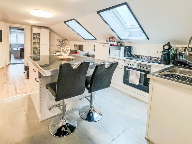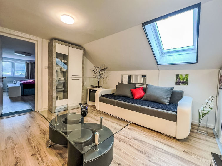 Apt 2 pièces 70 m2 au 1er étage. Spacieux et clair, partiellement mansardé, rénové en 2022, aménagement très confortable et de style: séjour/chambre à coucher mansardé avec fenêtre sous le toit avec 2 divans-lits doubles, TV et chaînes de TV internationales (écran plat). 1 chambre double avec Dressing. Cuisine ouverte (4 plaques de cuisson, four, lave-vaisselle, bouilloire électrique, micro-ondes, cafetière électrique) avec table pour les repas et bar. Douche/WC. Chauffage électrique. Sol en parquet. Très belle vue sur les montagnes. A disposition: lave-linge, sèche-cheveux. Internet (Connexion WIFI, gratuit). Veuillez noter: logement non-fumeur. Maximum 2 animaux/ chiens autorisés.