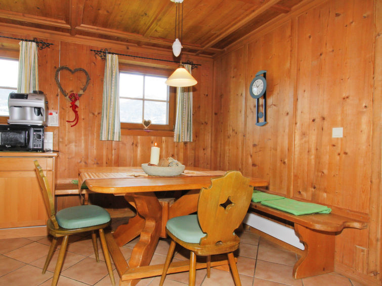 Maison 4 pièces 75 m2 sur 2 niveaux. Aménagement plaisant et avec beaucoup de bois: entrée. Cuisine/séjour (four, lave-vaisselle, 4 plaques vitrocéramiques, four micro-ondes, gril, cafetière électrique) avec coin repas, TV (satellite), radio et poele de faience. Sortie sur le jardin. Douche, WC séparé, double vasque. À l'étage supérieur: 1 chambre double. 1 chambre avec 2 lits. 1 chambre avec 1 x 2 lits superposés. Sol en parquet. Terrasse. Chaises longues (4). Superbe vue panoramique sur les montagnes et la vallée. A disposition: lave-linge, sèche-cheveux. Place de parking (couvert, 2 Voitures). Machine à espresso Saeco à disposition.