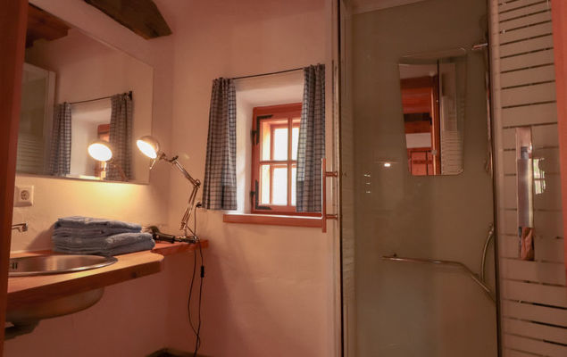 "Panoramahütte", chalet 2 pièces 50 m2 sur 2 niveaux. Logement idéal pour 2 adultes + 1 enfant. Aménagement romantique et avec beaucoup de bois: séjour/chambre à coucher avec 1 divan-lit (90 cm, longueur 190 cm), coin repas. Petite cuisine ouverte (1 plaques à induction, four micro-ondes, cafetière électrique, Capsules pour machine à café (Nespresso) (NON INCLUSES)). Douche, WC séparé, douche à jets. Chauffage électrique. À l'étage supérieur: (escalier raide) alcôve mansardée, ouverte avec 1 lit double (160 cm, longueur 200 cm). Grande terrasse partiellement couverte. Meubles de terrasse, chaises longues (2). Très belle vue sur les montagnes et les alentours. A disposition: Internet (Connexion WIFI, gratuit). Veuillez noter: maison non-fumeur. 1 animal/ chien autorisé. Le refuge idéal pour un couple, des personnes à la recherche du calme et les amoureux de la nature. Le chalet est orné de nombreux détails et totalement isolé de l'extérieur. Proiftez-en pour recharger vos batteries. Selon vos souhaits, vous pourrez toujours retrouver les diverses facettes de la civilisation dans le "Moasterhaus". Si le nombre d’occupants n’atteint pas le maximum, toutes les maisons ne seront pas disponibles.