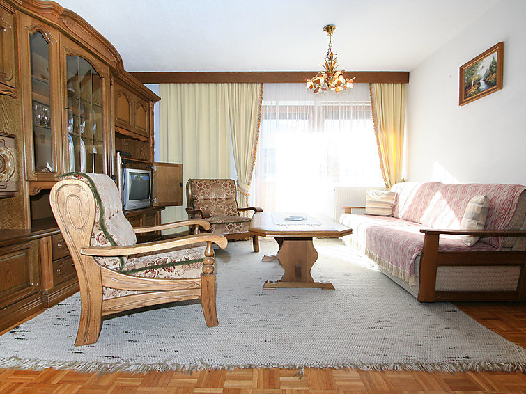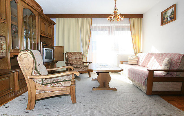 Apt 4 pièces 100 m2, à l'étage supérieur. Aménagement plaisant: entrée. Séjour/chambre à coucher avec 1 divan-lit double et TV (satellite). Sortie sur le balcon. 1 chambre double. Sortie sur le balcon. 1 chambre avec 2 lits et 1 lit double. 1 petite chambre avec 1 x 2 lits superposés (90 cm, longueur 200 cm). Cuisine (four, lave-vaisselle, 4 plaques vitrocéramiques, four micro-ondes) avec coin repas. Sortie sur le balcon. Bain/douche, WC séparé. Balcon. Meubles de terrasse, chaises longues. Belle vue sur les montagnes et les alentours. A disposition: Internet (Connexion WIFI, gratuit). Veuillez noter: logement non-fumeur. 1 animal/ chien de petite taille autorisé.