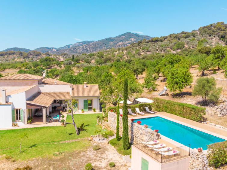 Caimari à 1 km de Selva: Grande villa confortable "Son Maguet", année de construction 2010, environnée par les arbres, prés et champs. En-dehors de la localité, à 1 km du centre de Caimari, situation tranquille, ensoleillée sur une colline, à 100 m de la forêt, à 25 km de la mer, à 25 km de la plage, dans la verdure. A usage privé: terrain à l'état naturel (clôturé), grand, beau jardin sur plusieurs niveaux avec pelouse et arbres, champ, piscine rectangulaire (10 x 5 m, disponibilité saisonnière: 01.Jan.-31.Dec.). Douche/WC dans l'espace piscine, douche extérieure, pergola, terrasse, meubles de jardin. Infrastructures de la Maison: accès internet, Connexion WIFI, réduit pour bicyclettes, chauffage central, air-conditionné, lave-linge. Accès en voiture (chemin non goudronné). Place de parking près de la maison sur le terrain. Magasin d'alimentation, supermarché, restaurant 700 m, bar 900 m, boulangerie 1.2 km, café 1 km, biergarten 900 m, centre à 15 minutes à pieds, arrêt du bus 1 km, plage de sable 27 km plage de graviers 27 km, plage de galets 27 km, plage de rochers 27 km. Port plaisance 27 km, marina 27 km, terrain de golf (18 trous) 28 km, ecole de surf 27 m, ecole de voile 33 km, tennis 1 km, centre équestre 4 km, centre sportif 1 km, piste cyclable 200 m. Veuillez noter: adapté(e) aux familles, indiqué pour séniors. Bien convenant à 12 adultes groupes de jeunes sur demande seulement. Déchargement et chargement des bagages à la location de vacances. Animaux dans le voisinage.
