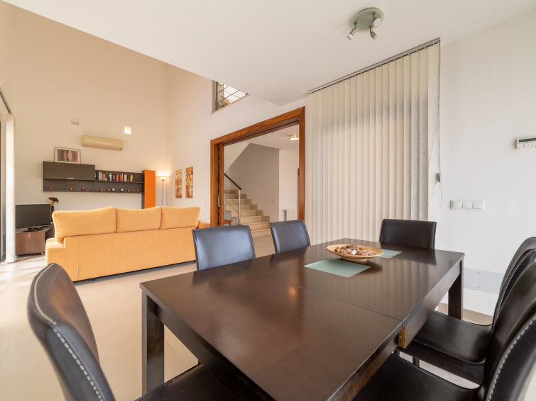 "Zafra (Can Aruna)", villa 4 pièces 170 m2 sur 2 niveaux. Logement idéal pour 6 adultes. Spacieux et clair, aménagement fonctionnel et confortable: grand séjour/salle à manger ouvert avec porte coulissante, baie vitrée avec table pour les repas, TV (satellite), Télévision numérique, écran plat, air-conditionné et chauffage à air chaud. Sortie sur la terrasse, sur la piscine. 1 grande chambre double avec 1 grand-lit (150 cm, longueur 190 cm), air-conditionné et chauffage à air chaud. Cuisine (four, lave-vaisselle, 3 plaques vitrocéramiques, grille-pain, bouilloire électrique, four micro-ondes, congélateur, cafetière électrique). Sortie sur la terrasse, sur la piscine. Douche/WC. À l'étage supérieur: 2 grandes chambres doubles avec baie vitrée, chaque chambre avec: 2 lits (90 cm, longueur 190 cm), air-conditionné et chauffage à air chaud. Sortie sur la terrasse. Douche/WC. Grand jardinet. Meubles de terrasse, mobilier de balcon, barbecue, chaises longues (4), loggia. Très belle vue sur la mer et les alentours. A disposition: lave-linge, fer à repasser, chaise haute pour enfant, lit bébé, sèche-cheveux. Internet (Connexion WIFI, gratuit). Place de parking (cloturée) près de la maison. Adapté(e) aux familles. ET3676