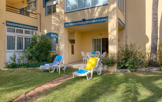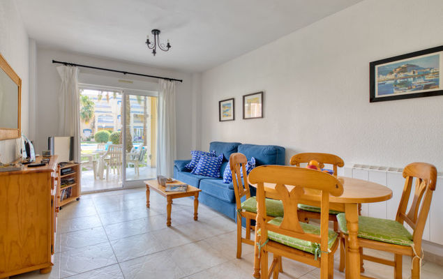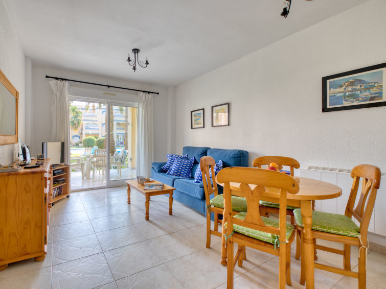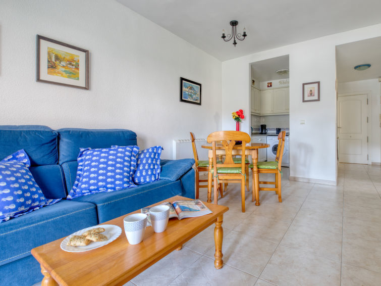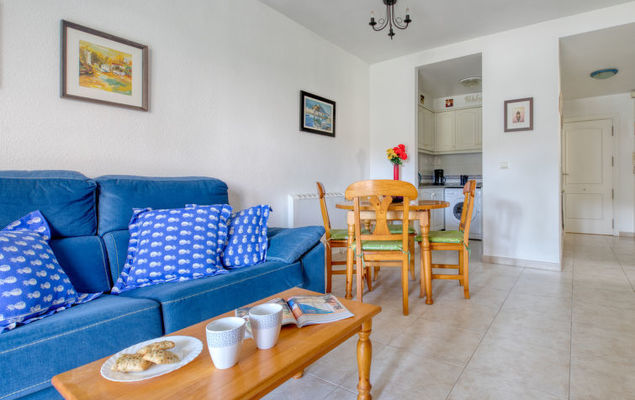 "Royal Playa II", apt 3 pièces 70 m2, au rez-de-chaussée. Aménagement fonctionnel: séjour/salle à manger avec TV (satellite), Télévision numérique, lecteur CD, chaîne stéréo, DVD et chauffage électrique. Sortie sur le jardin, sur la terrasse, sur la piscine. 1 chambre avec 1 grand-lit (1 x 150 cm, longueur 190 cm), chauffage électrique. 1 chambre avec 2 lits (90 cm, longueur 190 cm), chauffage électrique. Cuisine ouverte (3 plaques de cuisson, four micro-ondes, congélateur, gril). Bain/WC, WC séparé. Terrasse 12 m2, couverte. Meubles de terrasse, chaises longues (2). Vue sur la piscine et le jardin. A disposition: lave-linge. Internet (Connexion WIFI, gratuit). Place de parking No 6. Veuillez noter: 1 animal/ chien autorisé. TV seulement EN, ES. AT-432590-A