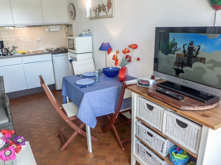 Studio 21 m2 au 2ème étage. Séjour/salle à manger avec 1 divan-lit double (140 cm, longueur 190 cm), TV (écran plat). Entrée avec 1 x 2 lits superposés (90 cm, longueur 190 cm). Coin cuisine (4 plaques de cuisson, grille-pain, bouilloire électrique, cafetière électrique, combiné micro-ondes). Douche/WC. Terrasse 8 m2, situation sud. Meubles de terrasse. Vue sur la piscine. A disposition: Internet (Connexion WIFI, en sus). Place de parking. Veuillez noter: maximum 1 animal/ chien autorisé. Détecteur de fumée.