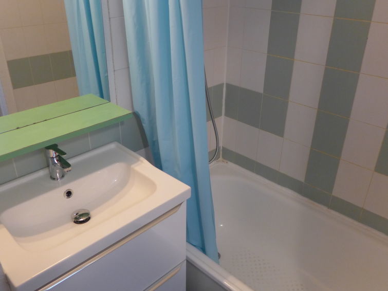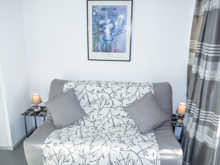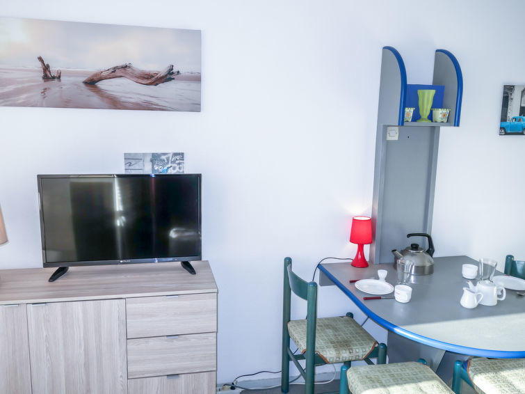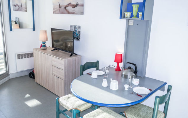 Studio 19 m2 au 1er étage. Entrée avec 1 x 2 lits superposés (80 cm, longueur 190 cm). Séjour/salle à manger avec 1 divan-lit double (1 x 160 cm, longueur 200 cm), TV (écran plat). Sortie sur le balcon. Coin cuisine (2 plaques à induction, grille-pain, four micro-ondes, cafetière électrique) avec ventilateur. Bain/WC. Balcon 6 m2, situation ouest. Meubles de terrasse. A disposition: fer à repasser. Internet (Connexion WIFI, en sus). Veuillez noter: logement côté parking. Maximum 1 animal/ chien autorisé. Détecteur de fumée. Veuillez noter: SAISON 2021: en raison du COVID - la piscine de la résidence sera ouverte selon un protocole précis avec des plages horaires réduites.