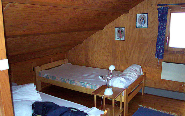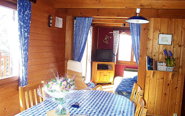 Chalet 2 pièces 51 m2, rez-de-chaussée surélevé. Séjour/salle à manger 20 m2 avec 1 divan-lit double, Télévision numérique, vidéo et chaîne stéréo. Sortie sur la terrasse. 1 chambre avec 1 grand-lit. Coin cuisine (4 plaques de cuisson, four, lave-vaisselle, four micro-ondes, congélateur, cafetière électrique). Bain/WC. Chauffage électrique. À l'étage supérieur: (escalier raide) galerie mansardée, hauteur plafond 100 - 200 cm avec 2 lits. Terrasse 20 m2. Meubles de terrasse. A disposition: lave-linge. Veuillez noter: (en sus). 1 animal/ chien autorisé.