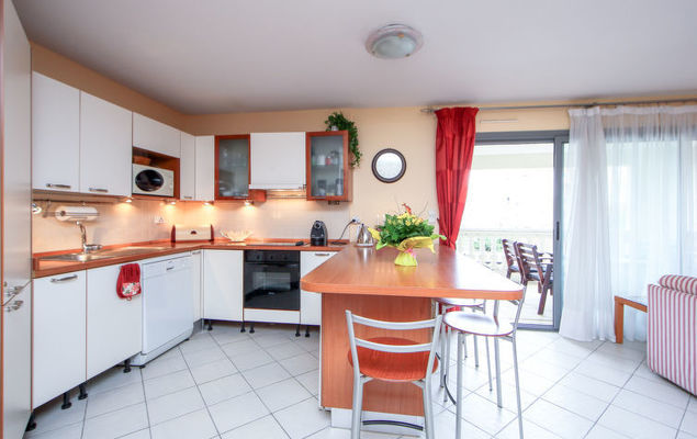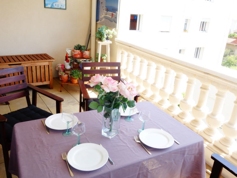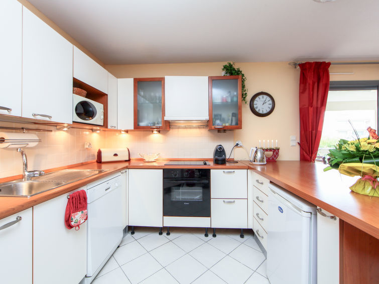 Apt 4 pièces 100 m2 au 3ème étage. Aménagement agréable: séjour/salle à manger 24 m2 avec TV (satellite), radio et DVD. Sortie sur la terrasse. 1 chambre avec 1 grand-lit (160 cm, longueur 200 cm), bain/bidet/WC. 1 chambre avec 1 lit gigogne (2 pers. 2 x 80 cm, longueur 190 cm), douche/bidet/WC. Sortie sur le balcon, orientée nord-ouest. 1 chambre avec 1 x 2 lits superposés (90 cm, longueur 190 cm), douche/bidet/WC. Sortie sur le balcon, orientée nord-ouest. Cuisine ouverte (4 plaques de cuisson, four, lave-vaisselle, four micro-ondes). Chauffage électrique. Balcon 8 m2, situation nord-ouest, terrasse 18 m2 partiellement couverte, situation sud-est. Meubles de terrasse. A disposition: sèche-cheveux. Internet (Connexion WIFI, en sus). Veuillez noter: détecteur de fumée. 06029003840HT