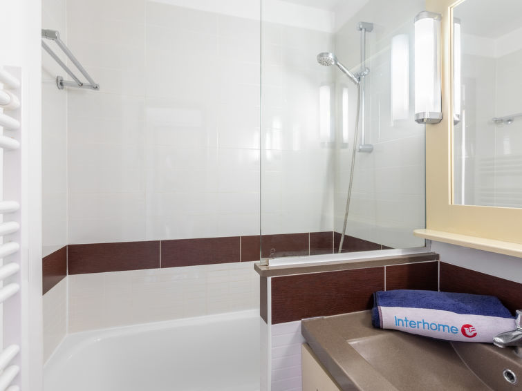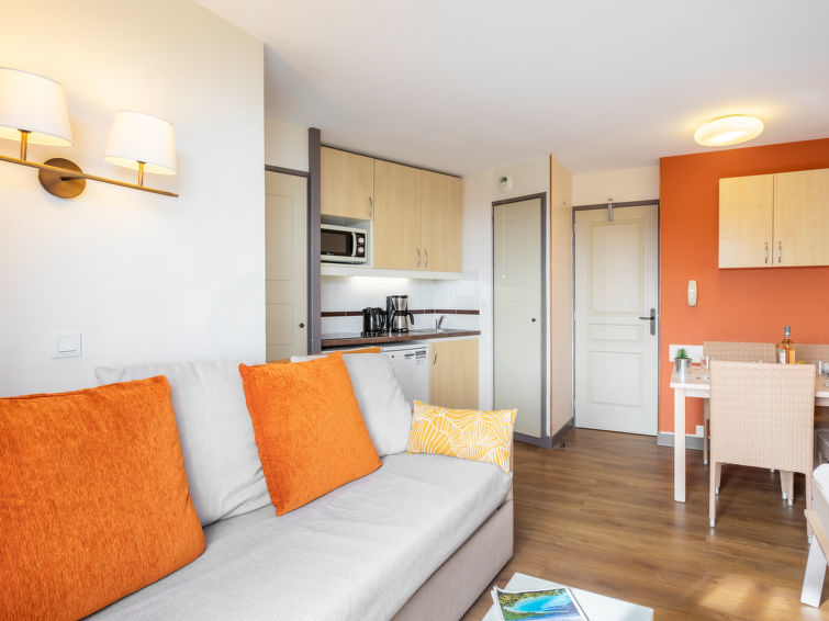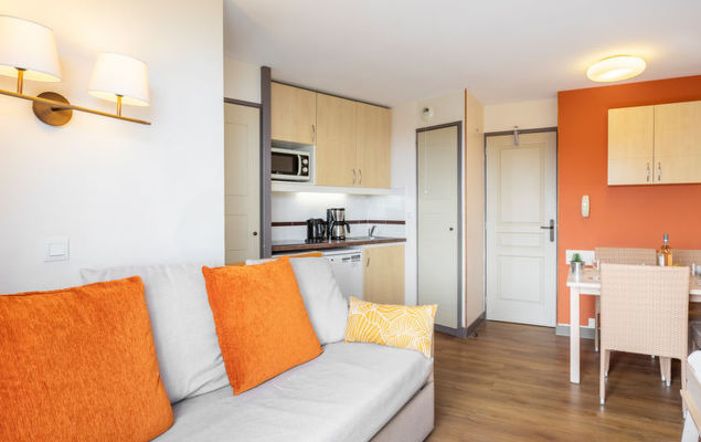 "Le Belvédère (D4 334)", apt 2 pièces 28 m2 au 2ème étage. Séjour/chambre à coucher avec 1 lit gigogne (2 x 80 cm, longueur 190 cm), TV (écran plat). Sortie sur la terrasse. 1 chambre avec 1 grand-lit (140 cm, longueur 190 cm), TV (écran plat). Sortie sur la terrasse. Coin cuisine (4 plaques de cuisson, lave-vaisselle, grille-pain, bouilloire électrique, four micro-ondes, cafetière électrique). Salle de bains, WC séparé. Chauffage électrique. Terrasse 10 m2. Meubles de terrasse. Vue sur la mer. A disposition: Internet (Connexion WIFI, en sus). Place de parking (couvert). Veuillez noter: logement non-fumeur. Détecteur de fumée.