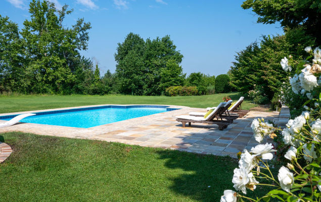 Belle maison de campagne "Villa Remotti", du 19ème siècle, environnée par les prés, champs et vignobles. Location composée d'un bâtiment principal et d'une annexe, à 28 km du centre d'Asti, en bordure de la localité, à 2 km du centre de Fubine, à 16 km du centre d'Alessandria, situation tranquille, ensoleillée, surélevée. En commun: terrain 14 ha, piscine (12 x 6 m, profondeur 120 - 180 cm, disponibilité saisonnière: 15.Mai.-15.Oct.). Douche extérieure, tennis, pergola. A usage privé: terrain 1'000 m2 (clôturé), jardin avec pelouse. Accès en voiture par un chemin de 300 m de long (chemin non goudronné). Place de parking près de la maison sur le terrain. Supermarché 2 km, gare ferroviaire "Alessandria" 16 km. Terrain de golf (36 trous) 3 km. Attractions à proximité: Asti 29 km. Le propriétaire habite dans une partie de maison indépendante.