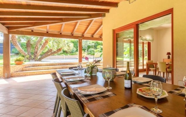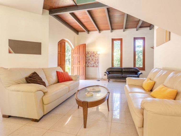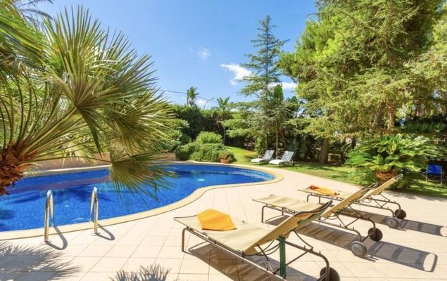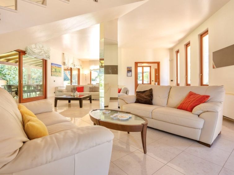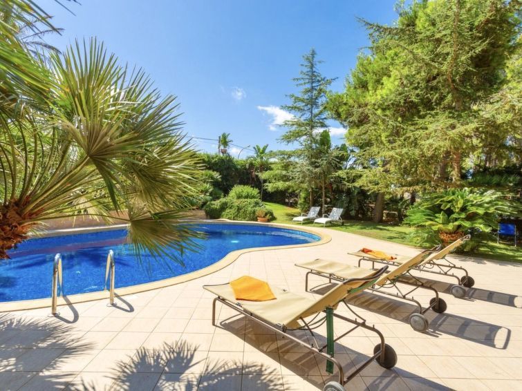 Villa 5 pièces 320 m2 sur 2 niveaux. Aménagement confortable et de bon goût: grand séjour/salle à manger avec baie vitrée avec TV (écran plat). Sortie sur le jardin, sur le jardinet, sur la piscine. Cuisine (4 plaques de cuisson, four, lave-vaisselle, grille-pain, bouilloire électrique, four micro-ondes, congélateur) avec petite table pour les repas. Sortie sur le jardinet. Douche/WC. À l'étage supérieur: 1 chambre double 50 m2 avec bain/douche/bidet/WC, double vasque, air-conditionné et chauffage à air chaud. Sortie sur le balcon. 2 chambres doubles, chaque chambre avec: air-conditionné et chauffage à air chaud. Sortie sur le balcon. 1 chambre avec 2 lits, air-conditionné et chauffage à air chaud. Sortie sur le balcon. Chambre avec passage. Sortie sur le balcon. Douche/bidet/WC. Air-conditionné, chauffage à air chaud. 4 balcons 4 m2, grand jardinet 50 m2, couvert. Meubles de terrasse, chaises longues. A disposition: lave-linge, fer à repasser, chaise haute pour enfant, lit bébé jusqu'à 2 ans, sèche-cheveux. Internet (Connexion WIFI, gratuit). Place de parking.