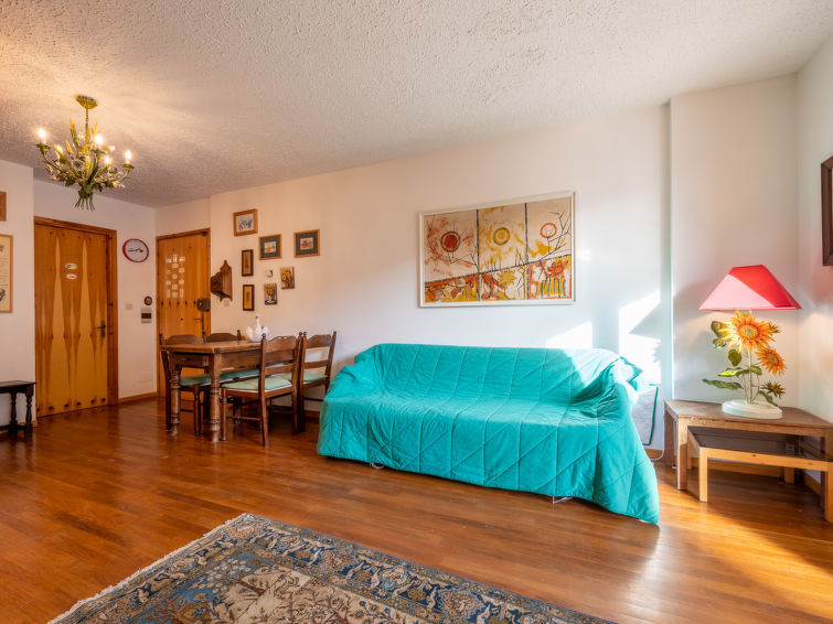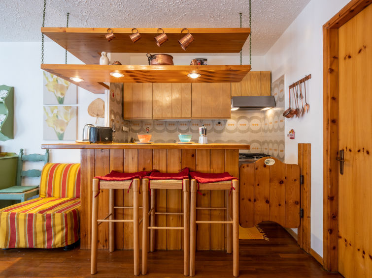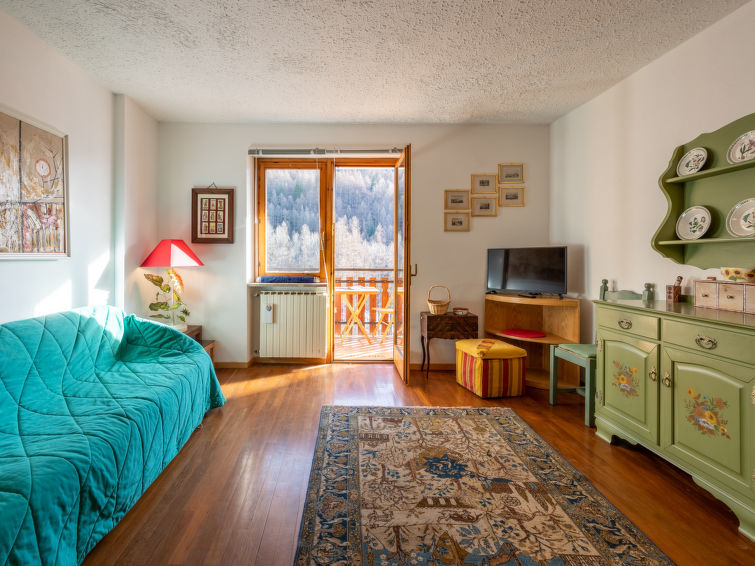 "Pineta Sportinia", apt 2 pièces 55 m2 au 2ème étage. Aménagement confortable et agréable: séjour/salle à manger avec 1 divan-lit double, table pour les repas, coin-cuisine et TV. Sortie sur le balcon. 1 chambre double. Sortie sur le balcon. Coin cuisine (4 feux, grille-pain, bouilloire électrique, cafetière électrique). Douche/bidet/WC. Chauffage au gaz. Possibilité de chauffage uniquement du 01.11. au 01.05. Sol en parquet. Mobilier de balcon. Belle vue sur les montagnes et les pistes de ski. A disposition: chaise haute pour enfant, sèche-cheveux. Internet (Connexion WIFI, gratuit). Veuillez noter: sans ascenseur. 00125900104