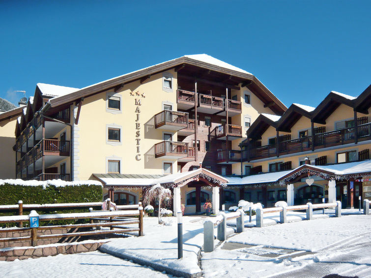 Résidence "Majestic". 90 appartements dans la résidence. À 400 m du centre de Predazzo, en bordure de la localité, à 12 km du centre de Moena, à 47 km du centre de Bolzano, situation ensoleillée. En commun: piscine couverte (disponibilité saisonnière: 01.Jan.-31.Dec.). Infrastructures de la Maison: réception, restaurant, sauna, salle fitness, bains de vapeur (hammam), salle de jeux, ascenseur, local pour les skis, lave-linge, sèche-linge (en commun, en sus). Place de parking sur le terrain, garage en commun (en sus). Train de montagne 2 km, téléski 2 km, location de ski 10 m. Arrêt du ski-bus 50 m. Les domaines skiables de renommée sont facilement accessibles: Ski Center Latemar. Port du bonnet de bain obligatoire.