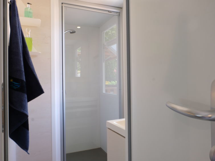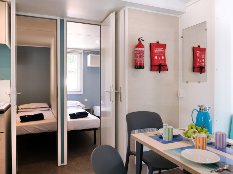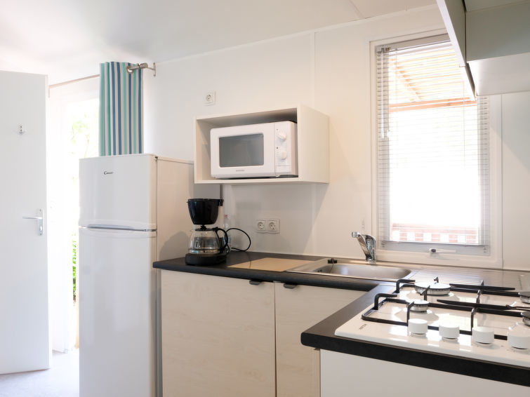 "Happy Premium", 4 pièces mobil home 30 m2. Logement idéal pour 6 adultes + 1 enfant. Aménagement confortable: séjour/chambre à coucher avec 1 couchage (69 cm, longueur 125 cm), table pour les repas, chauffage électrique et air-conditionné. 1 chambre avec 1 grand-lit (140 cm, longueur 190 cm). 2 chambres, chaque chambre avec: 2 lits (70 cm, longueur 190 cm). Cuisine ouverte (4 plaques de cuisson, four micro-ondes, congélateur, cafetière électrique). Douche/WC. Terrasse partiellement couverte. Meubles de terrasse, barbecue électrique (portable), chaises longues (2). A disposition: moustiquaire. Veuillez noter: logement non-fumeur. Maximum 1 animal/ chien de petite taille autorisé.