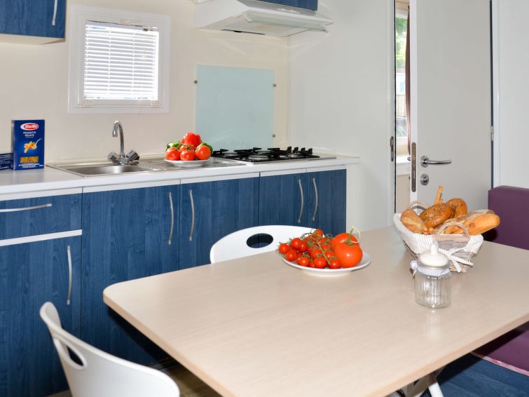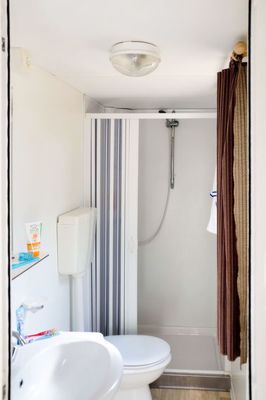 "Happy Standard", 3 pièces mobil home 25 m2. Logement idéal pour 4 adultes + 2 enfants. Aménagement fonctionnel: séjour/chambre à coucher avec 1 couchage (67 cm, longueur 135 cm), table pour les repas, chauffage électrique et air-conditionné. 1 chambre avec 1 grand-lit (140 cm, longueur 190 cm). 1 chambre avec 2 lits (70 cm, longueur 190 cm), 1 x 1 lits superposés (65 cm, longueur 179 cm). Cuisine ouverte (4 plaques de cuisson). Douche/WC. Terrasse couverte. Meubles de terrasse, barbecue électrique (portable), chaises longues (2). A disposition: moustiquaire. Veuillez noter: logement non-fumeur. Maximum 1 animal/ chien de petite taille autorisé.