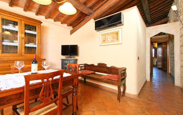 Apt 3 pièces 60 m2 au 1er étage. Aménagement fonctionnel et avec beaucoup de bois: séjour/salle à manger avec TV (satellite) et air-conditionné. 1 chambre double avec air-conditionné. 1 chambre avec 1 grand-lit (140 cm), air-conditionné. Coin cuisine). Douche/bidet/WC. A disposition: sèche-cheveux. Internet (Connexion WIFI, gratuit). Entrée par escalier extérieur (commun avec La Torretta). Les pièces en enfilade ne sont pas fermées par un plafond (les murs de séparation s'arrêtent au-dessus des portes, puis espace ouvert jusqu'au toit) . Architecture ancienne classée.