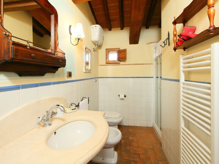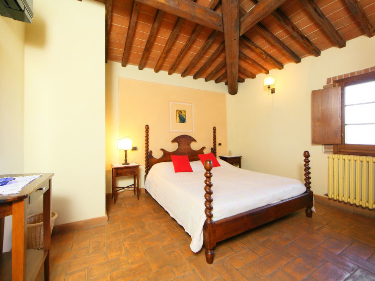 "Ischieto" est une ancienne ferme d'origine médiévale. Récemment rénovée, elle se situe dans les collines, à 800 m du village de Serre di Rapolano, 28 km de Sienne et 30 km de Montalcino, dans la charmante région au sud du Sienne, à 2 km seulement d'une célèbre station thermale. Elle a été divisée en 5 petits appartements agréables, meublés de façon plaisante et sympathique, tous avec TV (satellite) et chauffage (en sus, à régler sur place). Elle dispose d'espaces en plein air aménagés dans la verdure, d'une belle piscine, d'un petit terrain de tir à l'arc et de 2 VTT par appartement (gratuits). Le restaurant de la propriété est ouvert tous les soirs et peut organiser des déjeuners sur demande. Pour les amateurs d'équitation, le propriétaire organise, sur demande et en fonction de sa disponibilité, des randonnées dans les bois voisins (centre équestre à 6 km environ). Ferme ancienne "Casale Ischieto", rénovée, environnée par les champs. À 800 m du centre de Serre di Rapolano, à 28 km du centre de Siena, à 30 km du centre de Montalcino, sur une colline, dans la verdure. En commun: terrain 50 ha, piscine (16 x 9 m, profondeur 80 - 165 cm, disponibilité saisonnière: 15.Mai.-03.Oct.) avec marches intérieures. Douche extérieure, meubles de jardin. A usage privé: meubles de jardin. Infrastructures de la Maison: restaurant, bar, chauffage payable localement (01.11.-01.04.), vélo à disposition. Accès en voiture jusqu'à la maison. Place de parking sur le terrain. Magasins 800 m, arrêt du bus 500 m, gare ferroviaire "Rapolano Terme" 2 km, centre thermal "Rapolano Terme" 2 km. Terrain de golf (9 trous) 21 km, tennis 2 km, centre équestre 6 km. Attractions à proximité: Castelnuovo Berardenga 18 km, Montepulciano 31 km, Pienza 37 km, San Quirico D'orcia 44 km. Veuillez noter: adapté(e) aux familles, indiqué pour séniors. D’autres appartements sont également proposés à la location dans cette maison de vacances.
